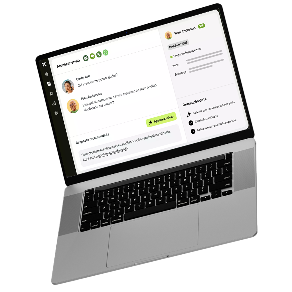 Dê aos seus clientes o suporte responsivo que eles esperam, por e-mail, voz, mensagens ou redes sociais. Escale as capacidades da sua equipe com a assistência de IA que está sempre disponível, enquanto o espaço de trabalho do agente ajuda os agentes a gerenciar e responder eficientemente a cada conversa.